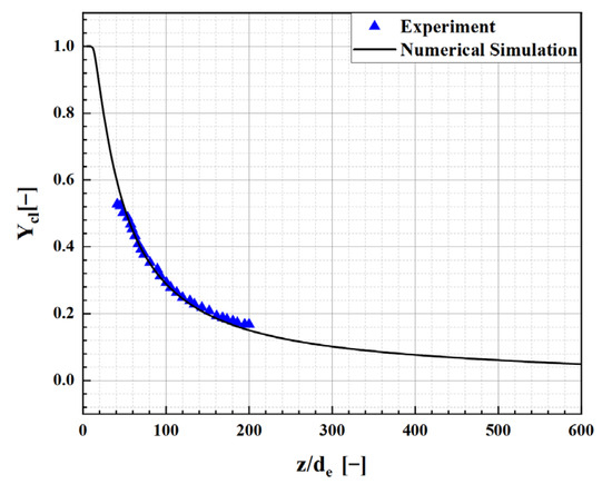 In Figure 4, z represents the distance along the centerline from the leakage orifice, de is the diameter of the leakage orifice, and Ycl is the mole fraction of hydrogen along the centerline. As can be seen from the figure, the numerical simulation results for the mole fraction of hydrogen along the jet centerline are in good agreement with the experimental results, and both show a consistent trend. This indicates that the virtual nozzle model and numerical simulation method described earlier can simplify the process of high-pressure hydrogen leakage and effectively predict the mole fraction along the hydrogen jet.