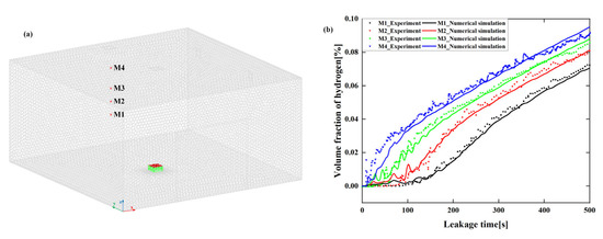 Furthermore, we used the experiment data of Pitts et al. [33] for numerical validation of hydrogen leakage and diffusion in an enclosed environment. Pitts et al. conducted experiments in a garage with dimensions of 6.1 m × 6.1 m × 3.05 m. Hydrogen gas was released through a rectangular box with dimensions of 0.305 m × 0.305 m × 0.15 m at the center of the garage floor, with a flow rate of 994 L/min. There was a garage door in the middle of the front wall, measuring 2.4 m × 2.1 m. There were two observation windows on the right wall with a length of 0.2 m and height of 2.3 m, and two skylights on the top of the garage for lighting, with a length of 0.3 m, located above the sensor array and hydrogen leak point. Select hydrogen concentration data from four sensors with the coordinates (3.05, 5.49, 1.14), (3.05, 5.49, 1.52), (3.05, 5.49, 1.9), and (3.05, 5.49, 2.59), labeled as M1, M2, M3, and M4, respectively, are shown in Figure 5a. A comparison between experimental data and numerical simulation results of hydrogen concentration near each sensor point is shown in Figure 5b. It can be seen that the numerical simulation results are slightly lower than the experimental data, and this trend is consistent during the leakage. In general, the method of numerical simulation described in the previous section can predict the hydrogen leakage and diffusion behavior, and the results are credible.