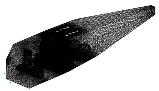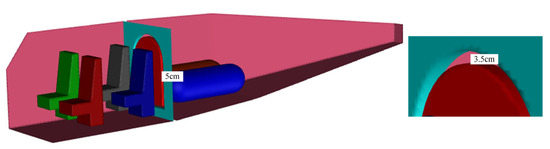 Based on a new-designed four-seater hydrogen internal combustion aircraft, the physical model of the aircraft was established, with a length of 6 m, a width of 1 m, and a height of 1.1 m (6 m × 1 m × 1.1 m). The aircraft carries two carbon fiber winding hydrogen storage tanks, which are located at the rear of the fuselage, and the pressure of the hydrogen in the tanks is 35 MPa. The structure inside the aircraft is complex, including various pipelines and brackets, which makes it difficult to make mesh division for CFD. Therefore, we simplified it on this basis by keeping the two main hydrogen tanks, four seats, and a partition separating the tank storage compartment from the passenger compartment, with a thickness of 5 cm, which is closed on a daily basis and can be opened for daily inspection and maintenance of the aircraft’s hydrogen system, with a gap of 3.5 cm around the edge of the partition to simulate the diffusion of hydrogen through the gap to the front of the aircraft cabin due to poor sealing failure, as shown in Figure 6.