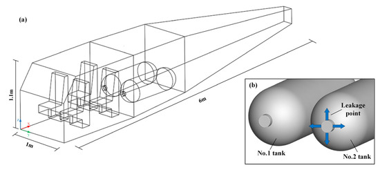 Considering the potential hazards and research costs, some researchers take a CFD approach to investigate hydrogen leakage and diffusion risk. José Antonio Salva et al. [12] analyzed the hydrogen leakage diffusion inside a fuel cell vehicle, with the leakage point set at the rear of the vehicle. The study found that installing ventilation devices inside the vehicle can significantly reduce the hydrogen concentration, thereby effectively lowering the risk of hydrogen accumulation and explosion. Wang et al. [13] used numerical simulation to perform transient and steady state analyses of hydrogen leakage diffusion in a hydrogen production container and quantified the consequences of hydrogen leakage using the TNT equivalent method. The study showed that, after a hydrogen leak, the arc-shaped dome structure of the hydrogen production room would preferentially accumulate flammable gas clouds, and ventilation windows should be placed at the top of the space. At critical ventilation flow rates, the damage radius could be reduced. Cui et al. [14] used numerical simulations to study the effects of leakage angle, ambient wind, and roof shape on hydrogen leakage diffusion in hydrogen refueling stations. The study found that hydrogen tends to accumulate on the underside of the roof, and a hydrogen detector placement scheme based on the simulation results achieved an alarm success rate of 83.33%. Lv et al. [15] used numerical simulations to investigate the hydrogen leakage diffusion and explosion characteristics of fuel cell vehicles in a parking lot when a thermal actuated pressure relief device (TPRD) was activated. The study showed that larger leakage diameters result in a wider and more concentrated hydrogen–air mixture cloud, and that ventilation significantly reduces the volume and concentration of the mixture cloud. Song et al. [16] used CFD methods to study hydrogen leakage inside hydrogen fuel cell vehicles (HFCVs), discussing the effects of different leakage locations, leakage rates, and ventilation conditions. The study found that different leakage conditions lead to different hydrogen concentration distributions within the vehicle, and proper placement of ventilation outlets can rapidly expel hydrogen, reducing the concentration inside the vehicle. Li et al. [17] used CFD methods to study the impact of obstacle positions on hydrogen leakage diffusion behavior in fuel cell buses. The study found that the distance between obstacles and the leakage source significantly affects hydrogen diffusion, with vertically placed obstacles promoting vertical diffusion and hindering horizontal transport, thus limiting the distribution of flammable zones within the vehicle. Mao et al. [18] studied the diffusion process of hydrogen between compartments in a fuel cell ship and numerically simulated the hydrogen explosion process caused by different ignition sources. The study found that the thermal radiation and overpressure damage from hydrogen explosions posed serious threats to the ship and its occupants, with the bow compartment being the least affected area and suitable as an ideal temporary refuge. Xu et al. [19] used numerical simulation methods to study the ventilation strategy of hydrogen–blended natural gas (HBNG) and recommended the installation of a safety interlock device to quickly shut down the pipeline in the event of a leak. Zhang et al. [20] developed a simplified model to study the leakage and diffusion of hydrogen gas in a rectangular space under natural ventilation. Kim et al. [21] used numerical simulation to study the effect of ship motion on hydrogen diffusion in enclosed areas. Lee et al. [22] developed a two-dimensional axisymmetric model using numerical simulation to study the temperature changes in hydrogen tanks under different pressure and temperature conditions during charging. Based on the numerical results, a regression equation was used to predict the maximum temperature of the tank. Yassin et al. [23] validated a CFD simulation package using different experimental results and showed good consistency; hence, this package can be used to simulate actual hydrogen leakage. Han et al. [24] numerically investigated the hydrogen concentration distribution through a hole with a size of less than 1 mm, and it satisfied the hyperbolic decay characteristics and fitted the experiment well. Zhang et al. [25] conducted a series of open space large-scale liquid hydrogen release experiments, comparing the diffusion of hydrogen in the atmosphere under different release apertures and ground materials. Xu et al. [26] used experimental and numerical simulation methods to study the diffusion of hydrogen mixed with natural gas in a sealed kitchen (using a mixture of nitrogen and helium as substitutes), and investigated the effects of parameters, such as explosion peak pressure, explosion overpressure, and explosion flame temperature.