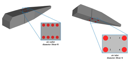 Therefore, we set up a ventilation layout on the roof and floor of the aircraft to investigate the effect of the ventilation on the hydrogen mole fraction in the cabin after a 35 MPa hydrogen leakage. The ventilation layout consisted of eight 10 cm-diameter holes on the roof of the aircraft and four 20 cm-diameter holes on the floor of the aircraft, which were symmetrically distributed along the aircraft’s roll axis, with passive air outlets on the roof of the cabin and active air intakes in the floor of the cabin, seen in Figure 9. The vents in the floor were numbered 1, 2, 3, and 4 to distinguish them from one another. During the forced ventilation scenario, the air inlet velocity was set to 20 m/s and 50 m/s, separately.