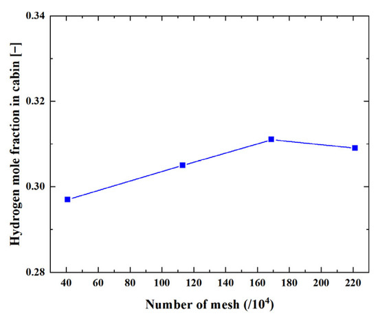 A hexahedral mesh was used to divide the space in the cabin, and the mesh of the model is shown in Figure 10. The mesh division is closely related to the accuracy of the numerical simulation results, so it is necessary to perform the mesh-independence verification, considering four mesh configurations with the number of cells from 4.1 × 105 to 2.2 × 106, as shown in Figure 11. It can be seen that, when the number of cells reaches 1.2 × 106, the difference in hydrogen mole fraction in the cabin is less than 2%. Finally, the mesh size at the hydrogen leakage point is set to 0.5 mm, at the air inlet and outlet, it is set to 5 mm, and the number of cells is 1,688,832.