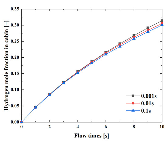 As the hydrogen leakage diffusion process in the cabin is a transient process, must be understood using transient calculations. When carrying out a transient numerical simulation, the size of the time step will have a great impact on the calculation results. In order to ensure the accuracy and efficiency of the calculation, it is necessary to perform the independence test of the time step, select the time steps of 0.001 s, 0.01 s, and 0.1 s for the test, and the results are as shown in Figure 12. Finally, the time-step was set to 0.01 s.