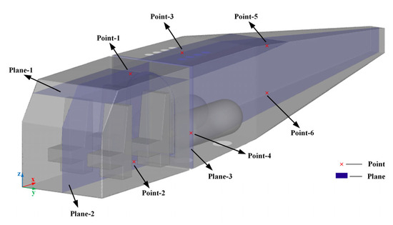 The hydrogen mole fraction field inside the cabin is three-dimensional, with a total of three planes selected on three coordinate axes that are perpendicular to each other, seen in Figure 13. Among them, plane-1 is an x–y plane; z = 1 m, plane-2 is an x–z plane; y = 0.5 m, and plane-3 is a y–z plane; x = 1.66 m, which is the plane at the leakage point. In addition, six points were selected in the front, middle, and rear of the cabin to ensure that different parts and heights of the cabin have monitoring points. The coordinates of these points are shown in Table 1.