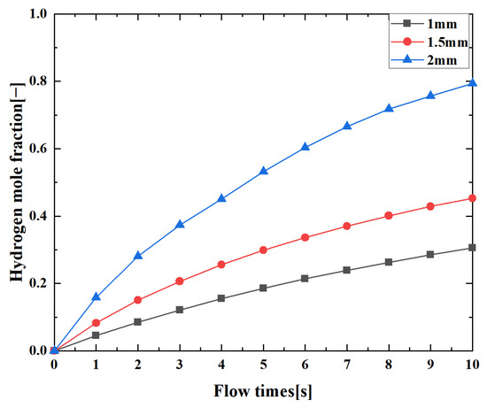 The leakage diameters were set to 1 mm, 1.5 mm, and 2 mm and the diameters of the virtual nozzles were set to 11.33 mm, 16.12 mm, and 21.5 mm, respectively. The leakage direction was the z+ direction, as shown in Figure 8. The relationship between the hydrogen mole fraction in the cabin and the leakage diameter is shown in Figure 14.