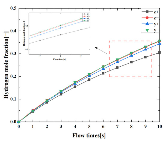 The location and direction of hydrogen leakage have a significant impact on the diffusion of hydrogen in the cabin. Based on the four potential leakage directions shown in Figure 8, the leakage diameter of hydrogen was set to 1 mm, and the diameter of the virtual nozzle was set to 11.33 mm. The relationship between the hydrogen mole fraction in the cabin and the leakage location was calculated, as shown in Figure 15.