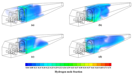 Hydrogen mole fraction volume rendering. (a) The leakage direction is z+. (b) The leakage direction is z−. (c) The leakage direction is y+. (d) The leakage direction is y−.
