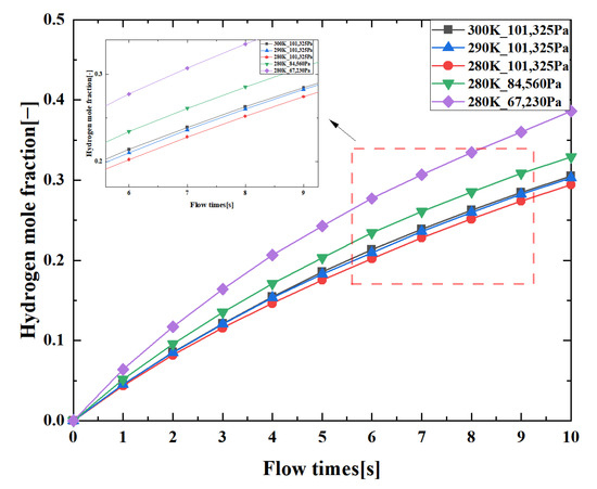 According to Fick’s first law Equation (15), the diffusion rate of hydrogen is influenced by the diffusion coefficient and concentration gradient. The relationship between the diffusion coefficient and environmental pressure and temperature can be known roughly in Equation (16). As the environmental temperature increases, the gas density decreases and the buoyancy decreases, suppressing the vertical movement, but this increases the horizontal diffusion behavior of hydrogen. In general, there is not significant difference in hydrogen mole fraction in cabin. When the environmental pressure decreases, the diffusion coefficient increases, thereby accelerating the diffusion of hydrogen. Meanwhile, the smaller molecular mass of hydrogen gas amplifies its diffusion behavior at low temperatures and pressures. Equation (15) is as follows: