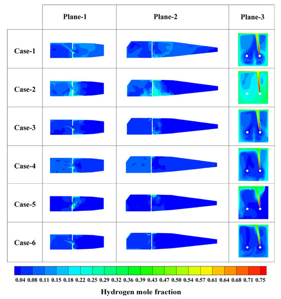 Figure 18 shows the hydrogen mole fraction contour on three planes of the cabin under different ventilation conditions, where the wind velocity of Case-1, Case-2, and Case-3 was 20 m/s and the wind velocity of Case-4, Case-5, and Case-6 was 50 m/s, respectively. It can be seen that the overall hydrogen mole fraction in the cabin decreases under forced ventilation, i.e., the increase in wind velocity is beneficial for the evacuation of hydrogen, while the areas with higher hydrogen mole fractions in the cabin are concentrated near the leakage point along the hydrogen jet, around the corner near the partition, and tend to diffuse along the cabin walls.