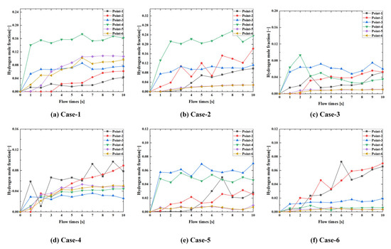 Hydrogen mole fraction samples were taken from the monitoring points mentioned earlier, and the variation in the hydrogen mole fraction at the monitoring points in the cabin with leakage time under Case-1 to Case-6 conditions was obtained, as shown in Figure 19.