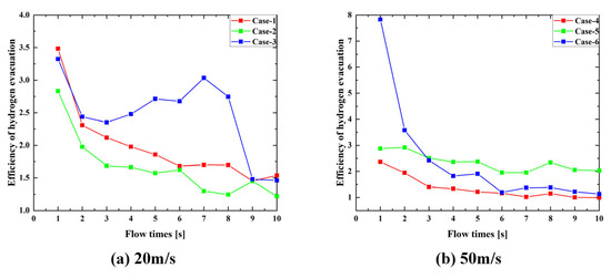 Efficiency of hydrogen evacuation at different velocities. (a) Velocity of wind is 20 m/s, (b) Velocity of wind is 50 m/s.