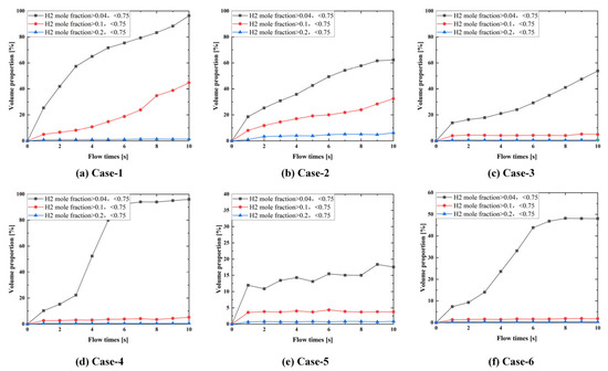 It can be seen that forced ventilation evacuates most of the hydrogen in the cabin, although residual hydrogen is difficult to evacuate. The hydrogen mole fraction in the cabin will reach dynamic stability, and the hydrogen evacuation efficiency also tends to stabilize after a period of forced ventilation. We calculated the volume proportion of different hydrogen mole fraction ranges in the cabin. Figure 21 shows the changes in the volume proportion of different hydrogen mole fraction ranges in the cabin over time under different ventilation conditions.