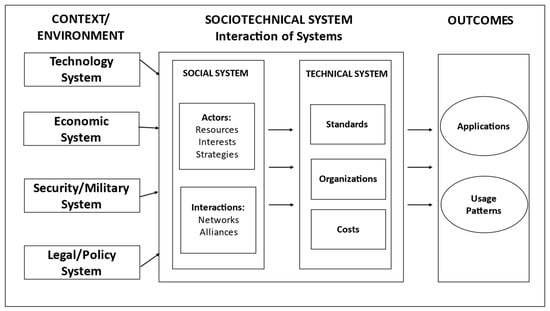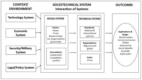 - The sociotechnical system is a complex entity characterized by the generation of multiple outcomes, manifesting as applications and patterns of use. A plethora of applications and uses have been identified, including but not limited to commercialization, militarization, global governance, scientific exploration, and social benefits.