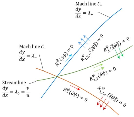29]. For subsonic flow, there is only one family of characteristic lines (the streamlines), while for supersonic flows there are two additional families of characteristics, the Mach lines that are inclined at an angle