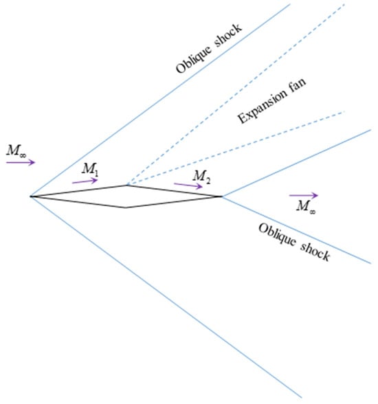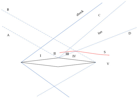 29]. The flow is parallel to the free stream upstream of the leading edge shock and downstream of the trailing edge “fishtail” shock. Between the leading edge shock and the leading Mach line of the expansion fan, the flow is parallel to the front segment of the airfoil, with a Mach number