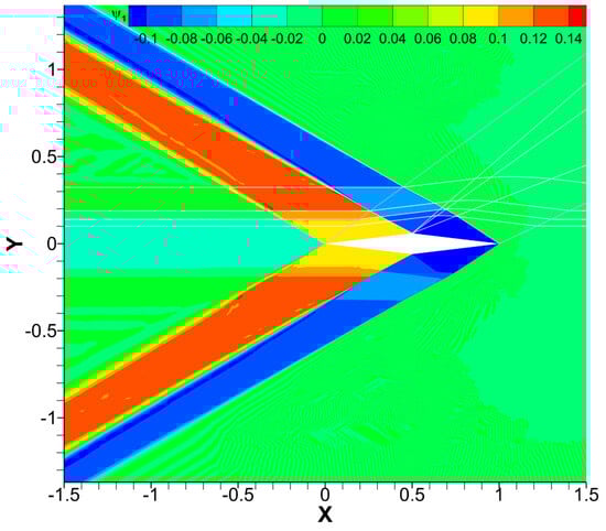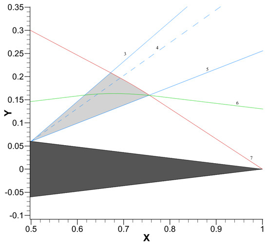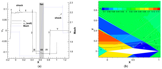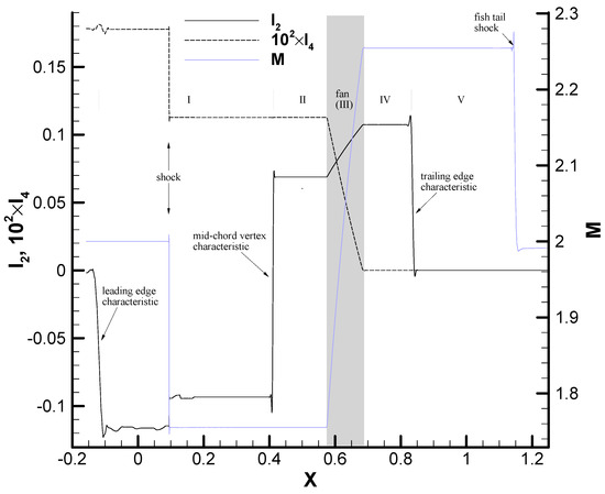 Both and vanish everywhere on the upper side of the airfoil, so it turns out that in the fan and . Now, within the fan and are only different from zero in the shaded triangle bounded by Mach lines 3, 5, and 7. While (and, thus, I4) is continuous across Mach line 7, (and, thus, I2) is not, and its jump depends on the local value of the flow, which explains the difference between the plateau values along each line of the fan.
