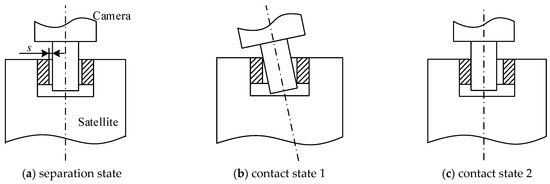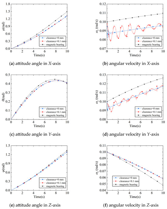 In the dynamics simulation, the coupling of satellite attitude angles exists due to the fact that the inertia product of the satellite system is not zero, according to Figure 6a,c,e. As the simulation time increases, the attitude angle is coupled with other attitude angles gradually; it increases first and then decreases near the end of the simulation. From Figure 6b,d, the simulation results indicate that the connection with the clearance exhibits a significant decrease in angular velocity along both the X-axis and Y-axis during the initial phase compared to the clearance-free connection. This is attributed to the impact effect induced by the clearance, where the camera exerts an impulsive force on the satellite in a direction opposite to the satellite’s motion direction, thereby reducing its angular velocity. During subsequent simulation phases, the presence of clearance allows the camera shaft to move within the clearance and repeatedly collide with the walls, resulting in continuous fluctuations in the satellite’s angular velocity.
