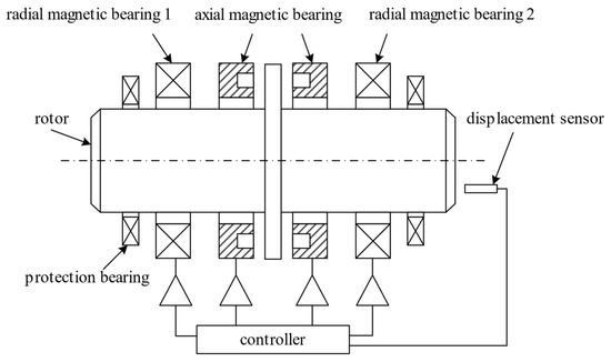 As shown in Figure 2, the magnetic bearing system consists of a rotor, an axial magnetic bearing, two radial magnetic bearings, and a protection bearing. The axial magnetic bearing constrains the translational DOF of the rotor along the Z-axis, and the two radial magnetic bearings constrain the translational DOF of the rotor along the X-axis and Y-axis, respectively. The protection bearing prevents the rotor from destroying the magnetic bearing, which is caused by sudden power failure and excessive disturbance. The displacement sensor detects the displacement of the rotor, and the controller adjusts the magnetic force of the magnetic bearing.