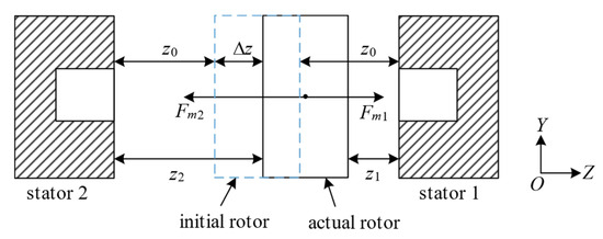 The translational DOF of the rotor along the Z-axis is constrained by the magnetic force of the axial magnetic bearing. As shown in Figure 3, and are the magnetic force from the two stators of the magnetic bearing, respectively; is initial clearance; is the displacement of the rotor centroid; , is the actual clearance to the stator 1 and the stator 2, respectively.