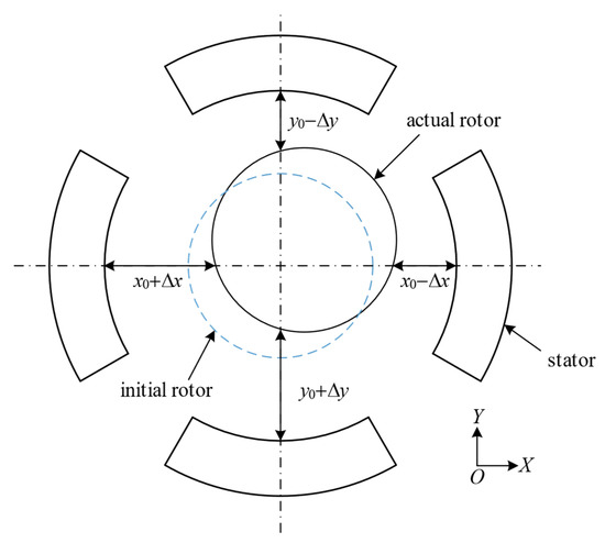 As shown in Figure 4, the radial magnetic bearing is configured with two pairs of magnetic stators to control the axial displacement of the rotor in both the X and Y directions. According to the displacement offset detected by the sensors, the magnetic force will be adjusted by the controller to eliminate the changes in the clearance. According to the Equation (7), the magnetic force can be expressed as: