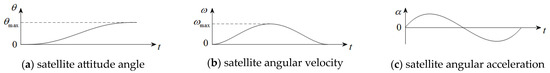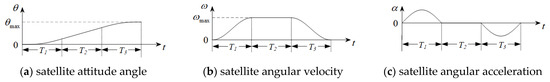 The polynomial attitude maneuver scheme refers to a motion planning method where the angular acceleration profile follows a polynomial function. In this section, the attitude maneuver scheme employs a quintic polynomial, which ensures that the angular acceleration during attitude maneuvers exhibits a smooth variation without abrupt changes. Notably, this scheme eliminates the constant velocity phase during the attitude maneuver. The resulting attitude maneuver scheme is illustrated in Figure 9, and the mathematical expressions for attitude angle , angular velocity , and angular acceleration during the maneuver are as follows:
