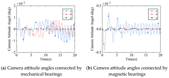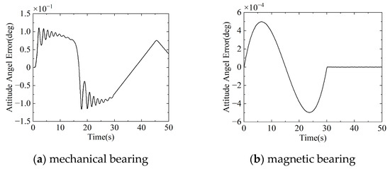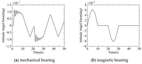 In Figure 11a, due to the clearance, the attitude angle of the camera connected by mechanical bearings vibrates violently, with a maximum amplitude of 0.01 deg and a vibration frequency of 0.4 Hz. According to Figure 11b, the vibration amplitude of the camera connected by the magnetic bearing does not exceed and decreases to after a period of time. It can be seen that the magnetic bearing can significantly reduce the influence of interference torque on camera attitude response.
