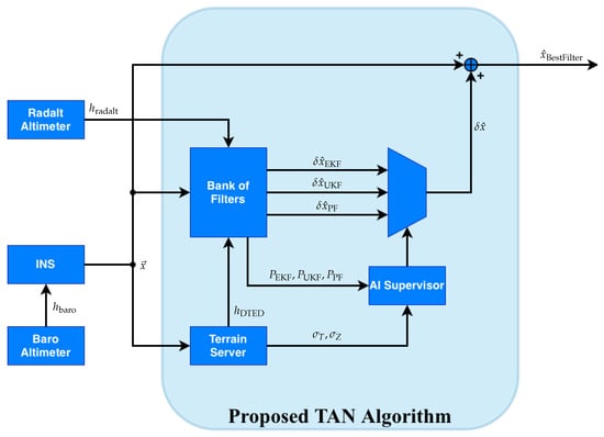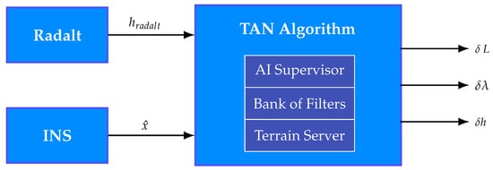 The TAN is fundamentally based on a sophisticated technique that includes intricate filter setups. We specifically implement and evaluate banks of adaptive filters, which dynamically react to varying terrain roughness and other environmental factors. This adaptive filtering method enhances the system’s tracking accuracy and considerably improves its resilience under diverse flying situations. Additionally, the TAN incorporates an AI-driven supervisory module that can automatically switch among various software designs, providing a warrant that the system selects the most efficient mode’s output at all times. A simplified diagram of the algorithm is given in Figure 2 with latitude δL, longitude δλ, and altitude δh errors in the geodetic coordinate system. Also, hradalt is the radalt clearance measurement and is the state vector that contains positions. A sophisticated search algorithm, designed for the acquisition phase, effectively analyzes topographical data to determine safe flight paths while reducing processing demands.