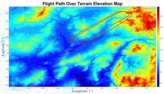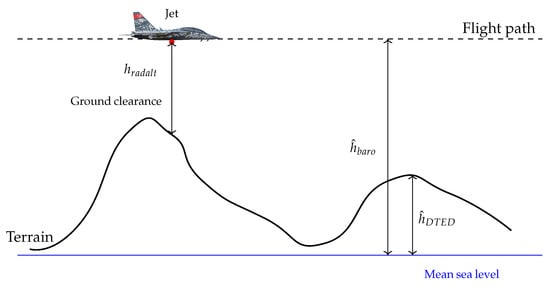 Terrain-aided navigation (TAN) entails determining the platform’s position by comparing the measured terrain profile with the onboard elevation data. These topographical profiles are generated utilizing data from the platform’s barometric altimeter and radar altimeter (RADALT). As depicted in Figure 3, the barometric altimeter provides altitude information relative to mean sea level , whilst the RADALT measures the platform’s elevation above the ground . The terrain elevation at the measurement location is determined by subtracting the RADALT value from the barometer altitude.