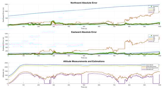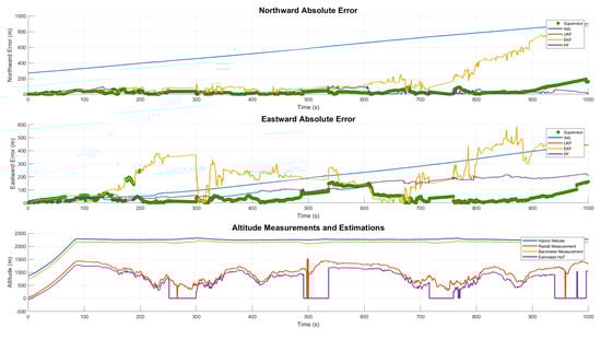 The FTI data absolute error results are given in Figure 8 and Figure 9 for two different flights. Parallel filter solutions give better navigation solutions than INS-only solutions as proposed.