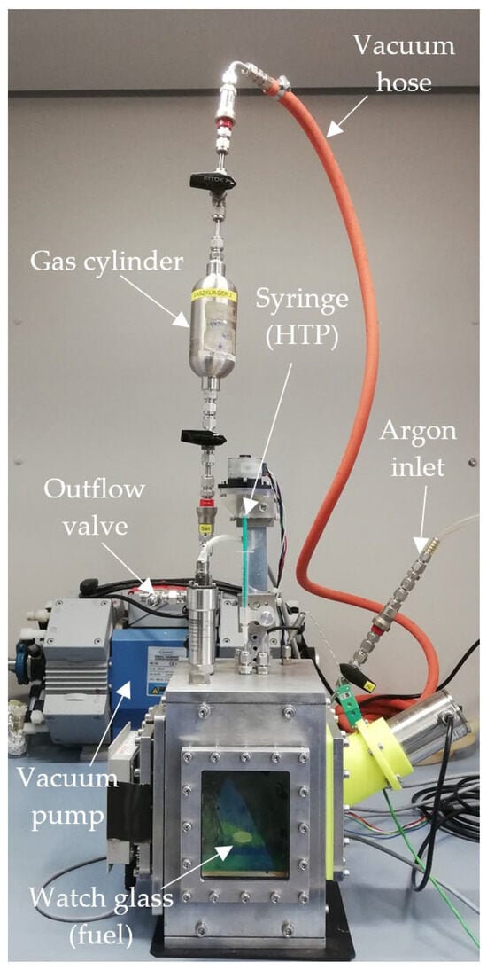 The hypergolic drop test experiments were conducted using an automated test setup. It consisted of an aluminum frame box with windows for optical access, both with a thickness of 10 mm. This configuration ensured that any hypergolic reaction would be safely contained within the chamber, which was also placed inside a closed fume hood during the experiments for additional safety. Inside the chamber, a small pool of fuel was prepared on a watch glass. Above, HTP was prepared in a syringe which was mounted on, and protruded through, the roof of the chamber. A step motor was used to drive the syringe and produce drops of HTP accurately and predictably. These then impacted the pool of fuel below. Due to the hypergolicity of the propellant combinations, this led to a spontaneous ignition.