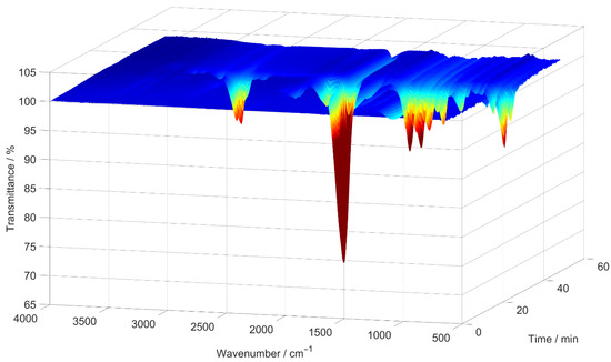 An Alpha Transmission FTIR spectrometer, manufactured by Bruker, Billerica, MA, USA, was used to analyze the decomposition products from the TGA tests. Sample scans were continuously taken during the heating process, resulting in three-dimensional spectra. In these, absorption is plotted over both wavenumber and time. The 3D spectra were recorded with a temporal resolution of 21 s and a wavenumber resolution of 2 cm−1. For comparison with the drop test spectra, these 3D spectra were converted from absorption (A) to transmittance (%T), according to Smith [24]: