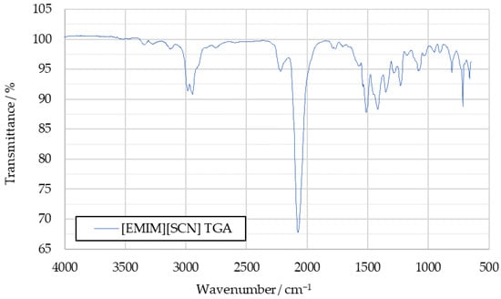 The IR spectrum obtained from a decomposition test with [EMIM][SCN] can be seen in Figure 10. The main finding of the TGA tests is that the decomposition products of [EMIM][SCN], HIP_11 and HIM_30 share little communality with the spectra obtained from the drop tests. They show significant amounts of peaks in the fingerprint region of the spectrum, between 1500 cm−1 and 500 cm−1. This is typical for complex molecules, rather than the simple combustion products discussed before.