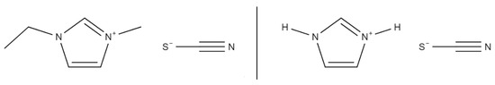 Structural formulas of [EMIM][SCN] (left) and [HIM][SCN] (right).