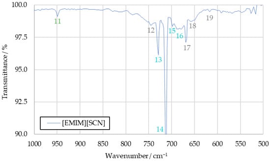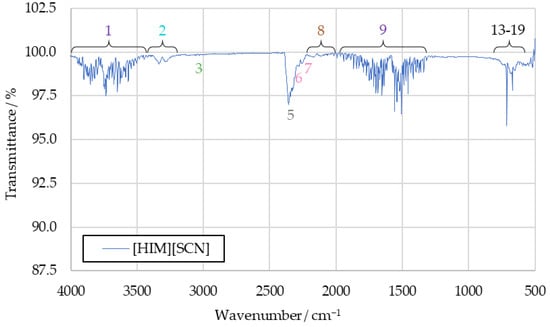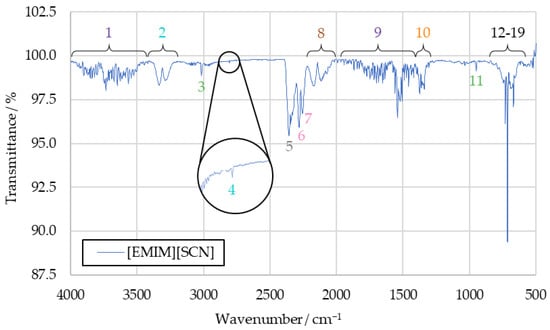 The spectra obtained from the initial benchmark campaign using [EMIM][SCN], HIP_11 and HIM_30 with 98 wt% hydrogen peroxide showed many similarities. All IR bands observed in one of the spectra could also be observed in any other of this series, albeit potentially with different intensity. Figure 5 shows the complete [EMIM][SCN] spectrum, with all the analyzed peaks or peak pairs labeled for referencing. The cluster of peaks between 600 cm−1 and 800 cm−1 is additionally shown in greater detail in Figure 6. Reference numbers have been color-coded to indicated signals proposed to originate from the same substance.