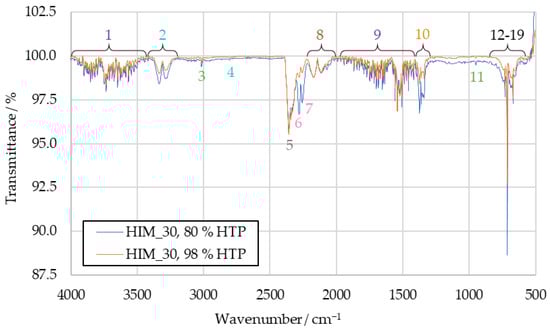 The HIM_30 combustion product spectrum with 80 wt% HTP can be seen in Figure 7, where it is compared to a spectrum obtained with 98 wt% HTP. For both HIM_30 and HIP_11, the increased IDT with 80 wt% HTP decreased the IR transmittance of the samples at the wavenumbers previously suggested for hydrogen cyanide, sulfur dioxide and the not clearly identified peaks 6 and 7. The corresponding HIP_11 spectrum is available in Figure A3.