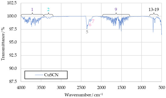 The resulting spectrum of CuSCN products can be seen in Figure 8. It shows significantly fewer peaks than the previous benchmark spectra, with only the ones attributed to water vapor (1 and 9), carbon dioxide (6, 17, 18 and 19) and hydrogen cyanide (2, 13, 14, 15 and 16) being visible. Additionally, the not unambiguously identified peaks 6 and 7 can be observed.