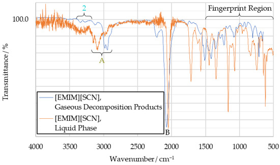 The decomposition spectrum of HIP_11 shows no significant differences to that of [EMIM][SCN]. Some bands, mostly those of hydrogen cyanide (peak 2) and thiocyanate (peak B), are observed with lower transmittance in the HIP_11 spectrum, and the peaks’ positions in the fingerprint region vary slightly, but otherwise, the spectra are largely identical.