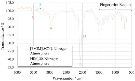 In the HIM_30 decomposition spectrum, more differences can be observed when comparing it to the [EMIM][SCN] decomposition spectrum, as shown in Figure 11. These mainly consist of two previously unobserved peaks, one at 3520 cm−1 (peak C) and one at 1991 cm−1 (peak D). No concrete substance could be identified for peak C, but given the elements present in the fuel, a hydrogen–nitrogen stretching vibration is considered the most likely cause of this signal. Peak D is likely a secondary thiocyanate peak, shifted from the main thiocyanate band because the thiocyanate ions are bonded to two different cations, one resulting from the decomposition of 1-ethyl-3-methyl-imidazolium, the other from regular imidazolium.