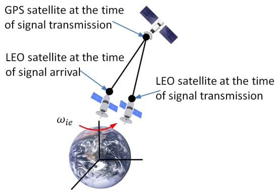 where I denotes an ECI frame synchronized with a corresponding ECEF frame, where e denotes the time of signal arrival. However, the position vector of the LEO satellite at the time of signal arrival needs to be expressed by [7]