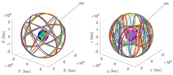 GPS constellation and a LEO in the ECI (left) and ECEF (right) frames.