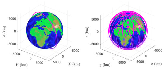 - Vallado, D.A. Fundamentals of Astrodynamics and Applications, 4th ed.; Microcosm Press: Portland, OR, USA, 2015; pp. 593–595. [Google Scholar]