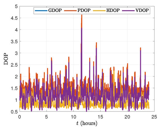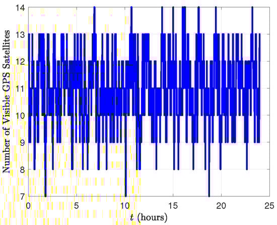 This subsection presents simulation results characterizing the GPS constellation, the LEO satellite trajectory, and the corresponding measurement data. Figure 3 and Figure 4 depict the GPS constellation and the LEO orbit in both the EC and ECEF reference frames. The visibility of GPS satellites from the LEO satellite is assessed by computing elevation angles. Based on these calculations, the number of visible GPS satellites and the associated dilution of precision (DOP) values are determined. Figure 5 shows that the number of visible satellites varies between 7 and 14, ensuring sufficient visibility for positioning. Figure 6 illustrates the geometric (GDOP), position (PDOP), horizontal (HDOP), and vertical (VDOP) dilution of precision. Although elevated DOP values are observed briefly near 11.5 h, the overall values remain within acceptable bounds, indicating favorable GPS observation geometry for LEO navigation.