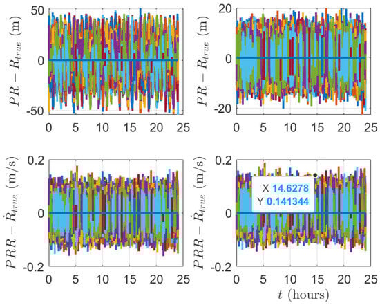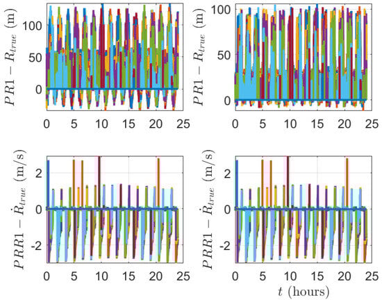 Figure 7 and Figure 8 present the differences between the PR and the true ranges (R), and the difference between the PRR and the true range rate () for both the L1 frequency measurements and the IEFC measurements, respectively. The left of Figure 7 shows the PR and PRR errors when signal time delays are not compensated, while the right of Figure 7 shows the PR and PRR errors when signal time delays are compensated. Though signal time delays are compensated in the right of Figure 7, they show very similar errors both in PR and PRR. This is due to the fact that the ionosphere error is more dominant than the effect of signal time compensation. On the other hand, the effect of signal time compensation is clear for the IEFC measurements in Figure 8. The left of Figure 8 shows the PR and PRR errors when signal time delays are not compensated, while the right of Figure 8 shows the PR and PRR errors when signal time delays are compensated. Unlike the PR and PRR errors in Figure 7, the PR and PRR errors in Figure 8 are reduced when signal time delays are compensated for the IEFC measurements. The comparison clearly demonstrates that accounting for signal propagation delays significantly reduces the errors in PR and PRR.