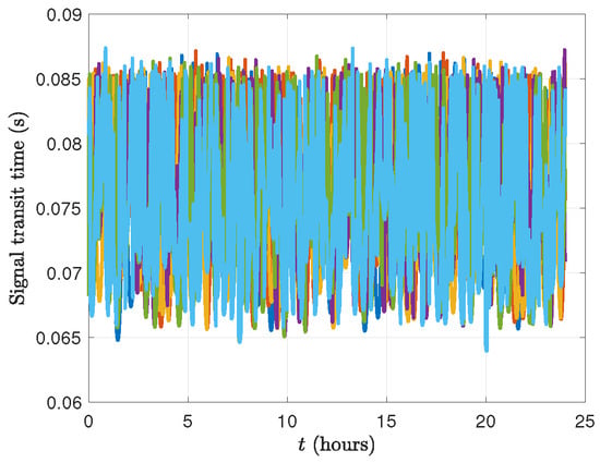 It is important to account for the signal transit time as the GPS satellite between the LEO satellite as a user distance generally changes over this interval. The LEO’s spaceborne GPS receiver obtains pseudorange measurements by multiplying its transit time measurements by the speed of light. The speed of light in free space is only constant in an inertial frame, where c = 299,792,458 m/s. In a rotating frame, such as ECEF, the speed of light varies. Consequently, the true range calculation is simplest in an ECI frame. Thus,