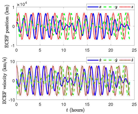 where , with as the correlation time, and is white Gaussian noise with variance . The equation of motion in Equation (5) for a LEO satellite is formulated in world geodetic system (WGS) 84 as an Earth-fixed reference frame to avoid the transformation of the measurement modeling and computation of the gravitational acceleration from the Earth-centered Earth-fixed (ECEF) frame to the Earth-centered inertial (ECI) frame. An EKF is adopted as the OD algorithm. The nonlinear differential equations of motion of a LEO in Equation (5) used for the dynamic model, which is numerically integrated using the Runge–Kutta 4th order in the EKF is given by a set of first-order stochastic differential equations: