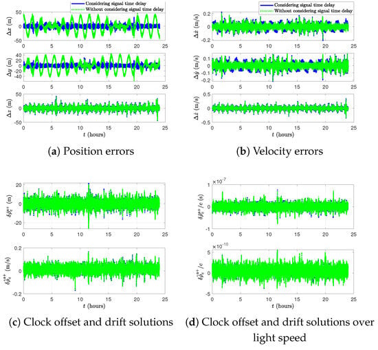 Figure 12 presents the measurement residuals for position and velocity in both estimation cases, serving as indicators of filter convergence. In Case 1, where signal transit time is neglected, the position residuals are bounded within approximately m, while in Case 2, with signal time delay compensation, the bounds are reduced to approximately m. Velocity residuals remain within m/s for both cases. The RMSE values of the position measurements are 13.875 m for Case 1 and 9.185 m for Case 2. For velocity measurements, the RMSE values are 0.095 m/s and 0.067 m/s, respectively. These reductions highlight the benefits of accounting for signal transit time in pseudorange measurements.