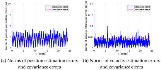 Figure 13 shows the position and velocity estimation errors along with their associated confidence bounds from the EKF covariance matrix for both cases. For Case 1, position errors are bounded within m and velocity errors within m/s. Case 2 shows improved performance, with position and velocity errors bounded within approximately m and m/s, respectively. In both cases, all estimation errors remain within the bounds, confirming the consistency of the EKF.