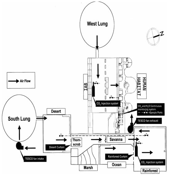 Biosphere 2 was the first large-scale attempt to build a closed habitat capable of supporting humans independently from Earth. It functioned as a mesocosm—a sealed system containing several interconnected ecosystems that mimicked Earth’s climates and environmental processes. As shown in Figure 1 (symbol in the upper-right corner of the figure represents the orientation of the structure), the project includes biomes such as desert, rainforest, savanna, thornscrub, mangrove–marsh, and a coral reef–ocean. The “Marsh” refers specifically to the low-salinity transition zone within the mangrove wetland system, simulating estuarine processes.