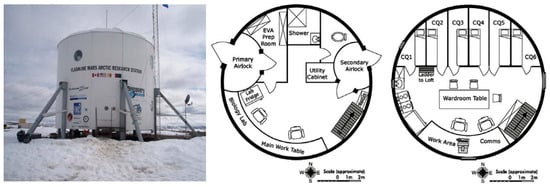 MARS, as the Mars Society’s inaugural simulated habitat project, is situated in the Mars-like environment of Devon Island in Canada’s High Arctic region. At its core stands a cylindrical habitat module with a diameter of 8 m (“The Hab”)—a two-level structure mounted on landing struts to simulate Martian surface conditions—with the capacity to integrate expandable inflatable auxiliary modules. This experimental platform progressively enhances both environmental verisimilitude and operational authenticity through continuous design iterations and increasingly realistic mission simulations, aiming to develop the operational protocols and technical systems required for sustained scientific expeditions on Mars [].