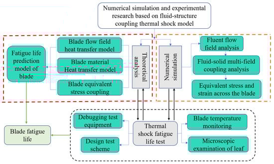 Initially, the blade is placed into the tester simulating the blade cascade environment for the adjustment of experimental equipment. The external air compressor was activated to supply stable high-pressure air. Aviation kerosene was ignited by an electronic igniter, generating high-temperature, high-pressure combustion gases for the external gas thermal shock under specified load boundary conditions. Subsequently, an electric heater was turned on to introduce a portion of the air stream from the compressor, providing internal cooling air for the blade during the experiment. The blade temperature was determined using thermocouples attached to the blade, allowing for comparison and analysis with simulated results. This informed adjustments to the experiment parameters by the control system, aligning them more closely with the simulated outcomes. High-temperature thermocouples were placed within the test blade array to measure the temperatures of the hot and cold gases, feedback was sent to the data acquisition system. This allowed for real-time adjustments of the hot and cold gas ratios for heating and cooling via the experimental spray system, thereby controlling the temperature variations in the external gas and cooling air throughout the entire experimental cycles [23].